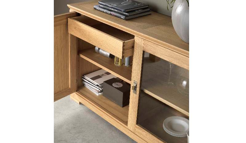 Anrichte Magneta 1005 V mittig mit einer Glastür, rechts und links je eine Holztür.
