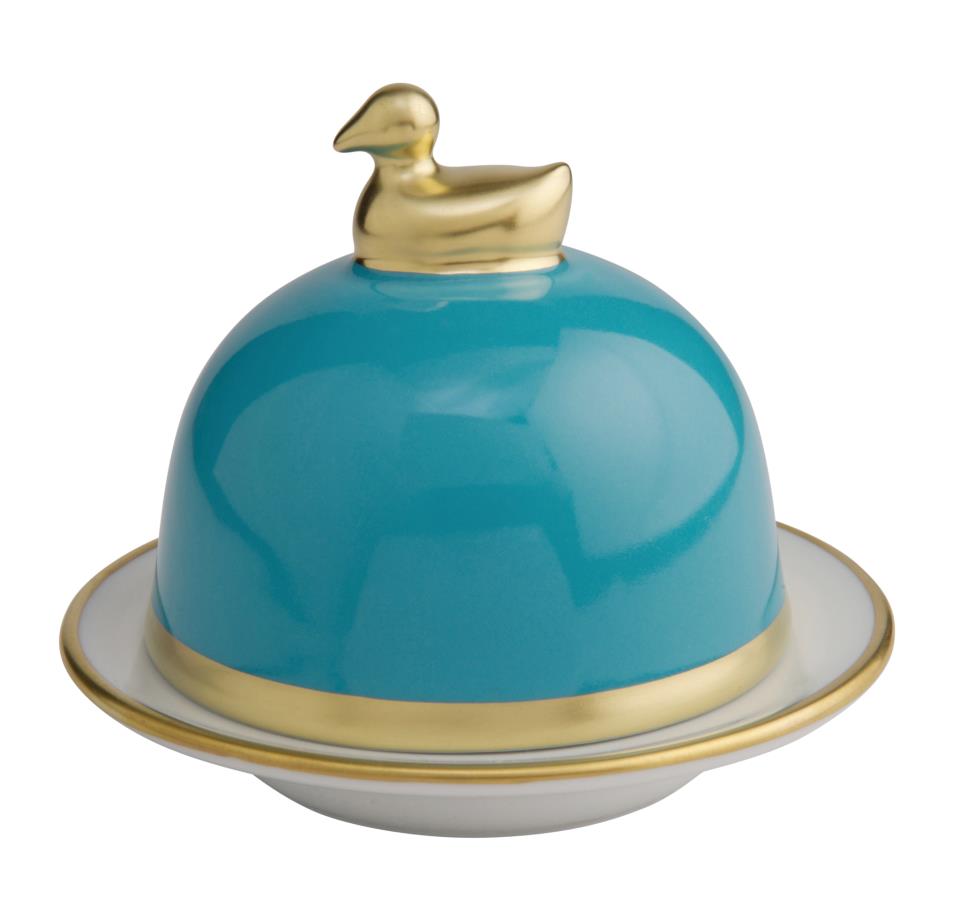 Kleine Butterdose mit Deckel und vergoldetem Enten-Griff / Beurrier Canard / duck butter dish